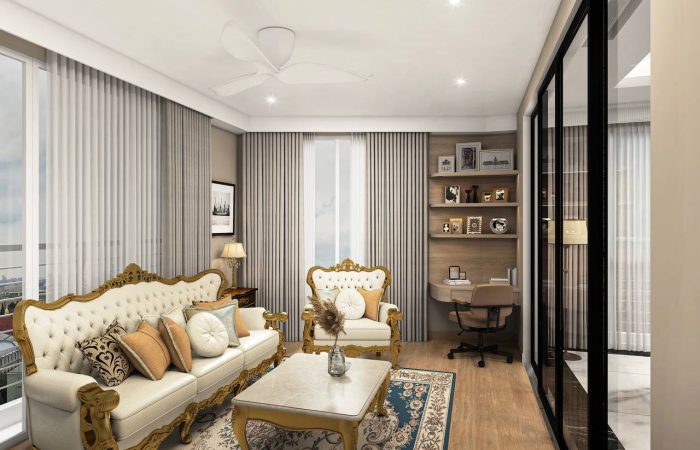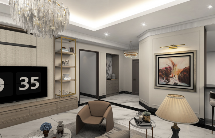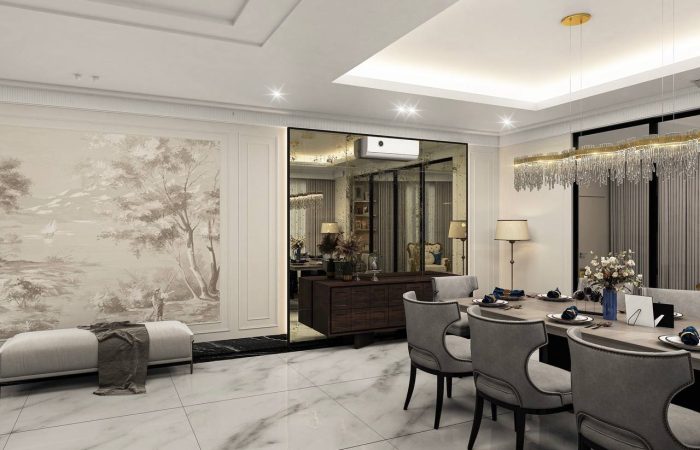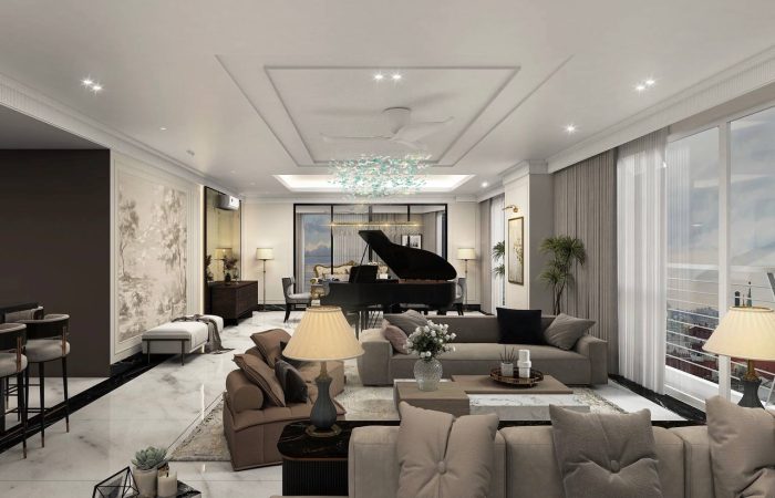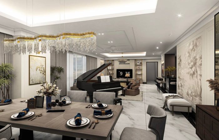 A sense of luxury and sophistication. The elegantly designed dining and living space, with its grand piano as a focal point, exudes a refined and tasteful ambiance.